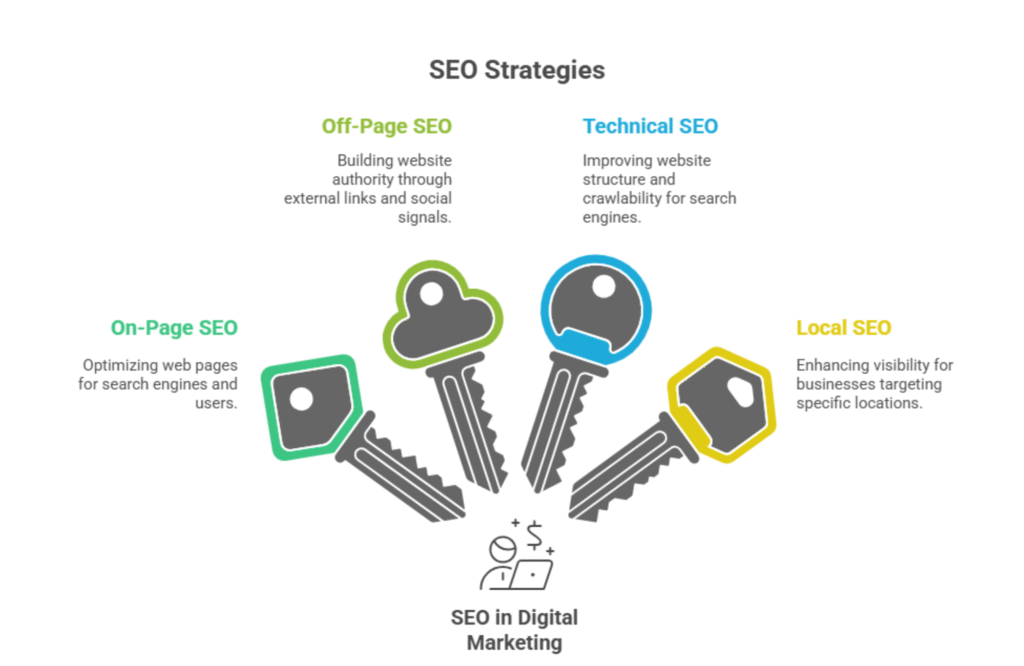 In simple terms, SEO in digital marketing ensures that your target audience finds you when they search using long-tail keywords, LSI keywords, or related queries. It combines technical SEO, on-site optimization, and off-site optimization techniques to make your website SEO-friendly, crawlable, and indexable for search engines.